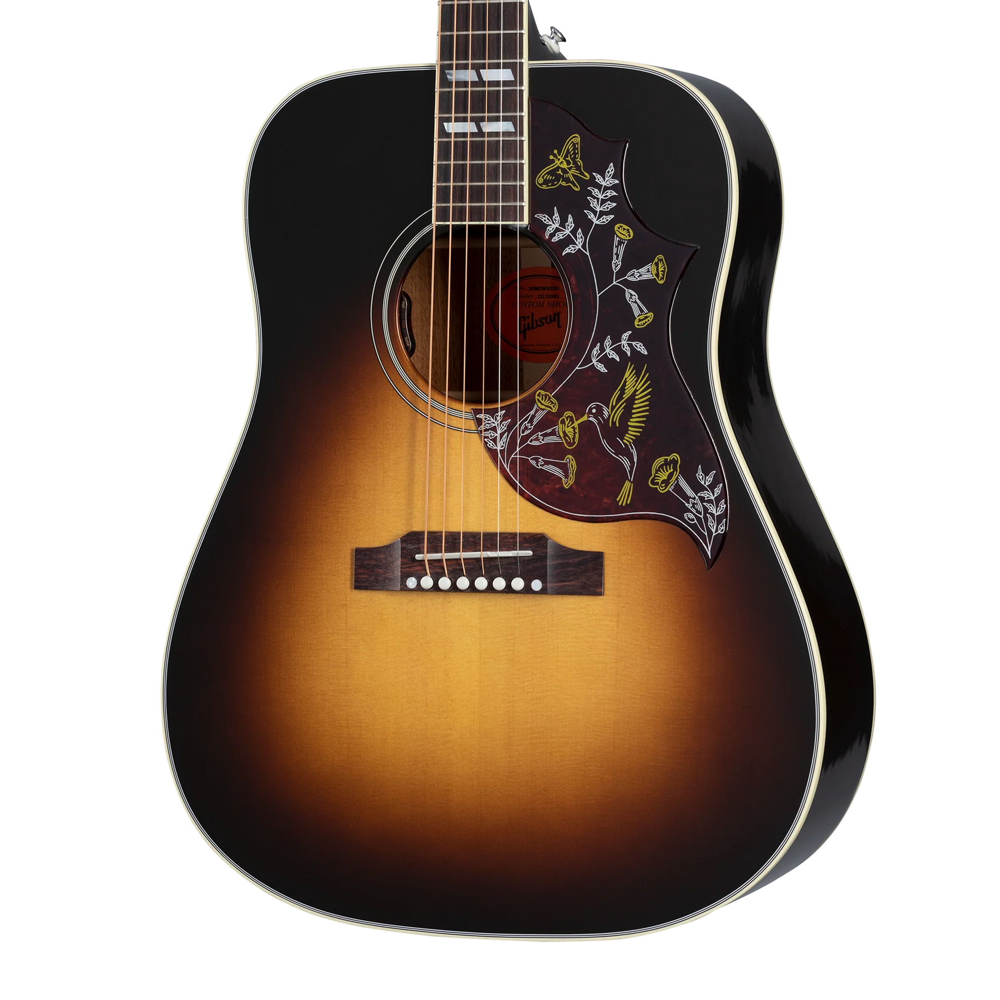Much of the Hummingbird’s appeal lies in its versatility. No matter how you attack this flat-top, it pumps out rich, deep tones, and is equally at home strumming first-position chords as it is taking the spotlight for picking lead lines. Its spacious mahogany body and sweet, select Sitka spruce top are more than capable of nailing down the rhythm in the hands of a rock and roll sideman or accompanying the most nuanced performance under the fingers of today’s alternative singer-songwriter. The Hummingbird's mahogany neck has a comfortable rounded profile and mother of pearl parallelogram inlays. This 'bird has a TUSQ® nut, saddle, and bridge pins, Grover® Rotomatic® tuners, the iconic Hummingbird™ graphics on the pickguard, and is equipped with LR Baggs® VTC electronics, so it's ready to plug in on stage or in the studio. A Gibson hardshell case is included.