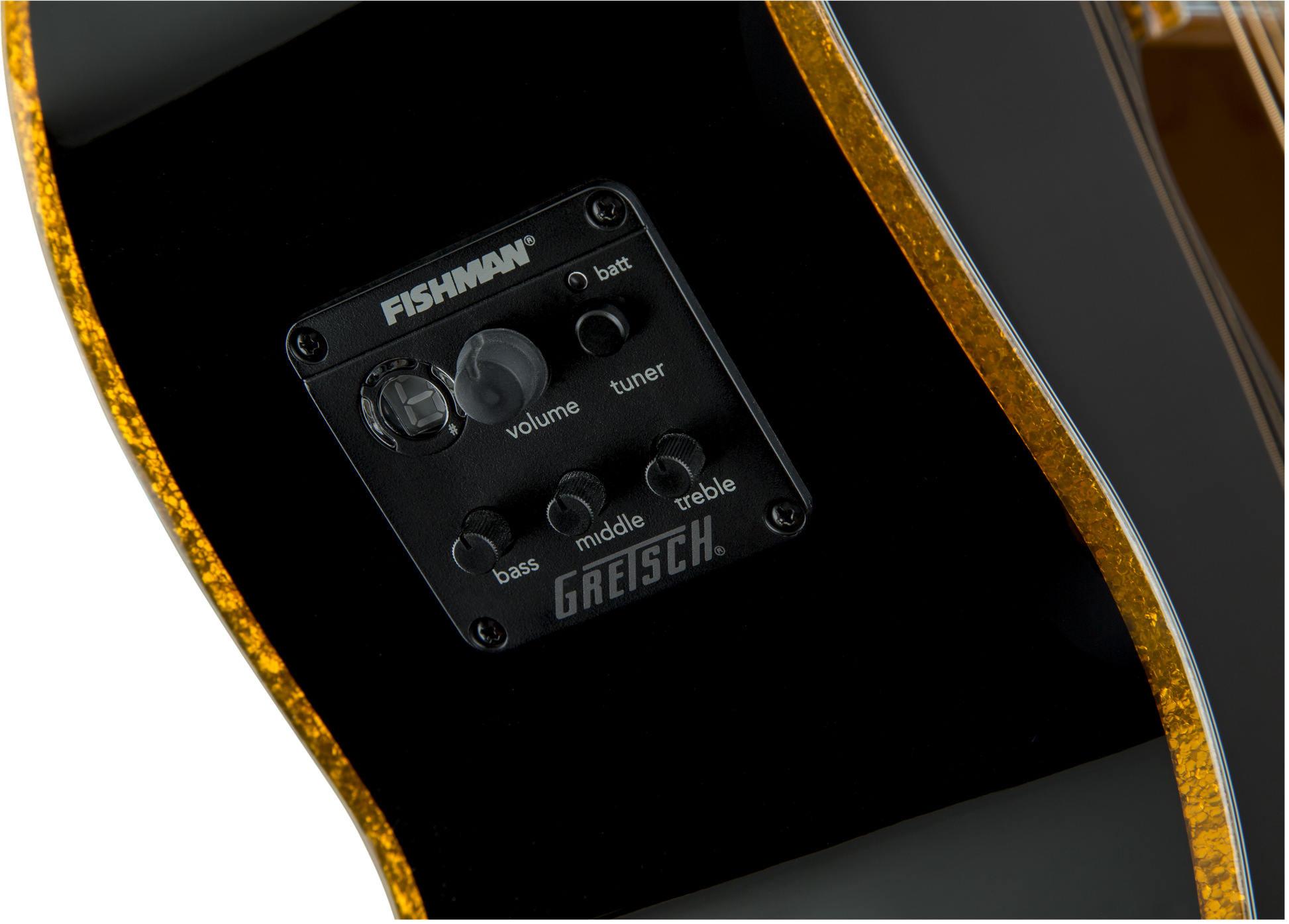 Its jumbo cutaway body includes dazzling gold-sparkle binding on the top, back, sound hole, fingerboard and headstock. Other premium features include a solid spruce top with scalloped "X"-bracing and classic Rancher triangular sound hole, maple sides and arched back, mahogany neck, 21-fret laurel fingerboard with Neo-Classic™ thumbnail inlays, "V"-shaped headstock with vertical winged "Gretsch" sparkle logo, compensated bridge with laurel base, deluxe tuners and gold-plated hardware.