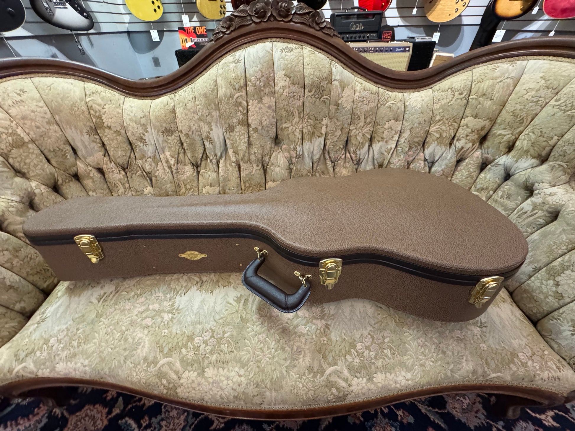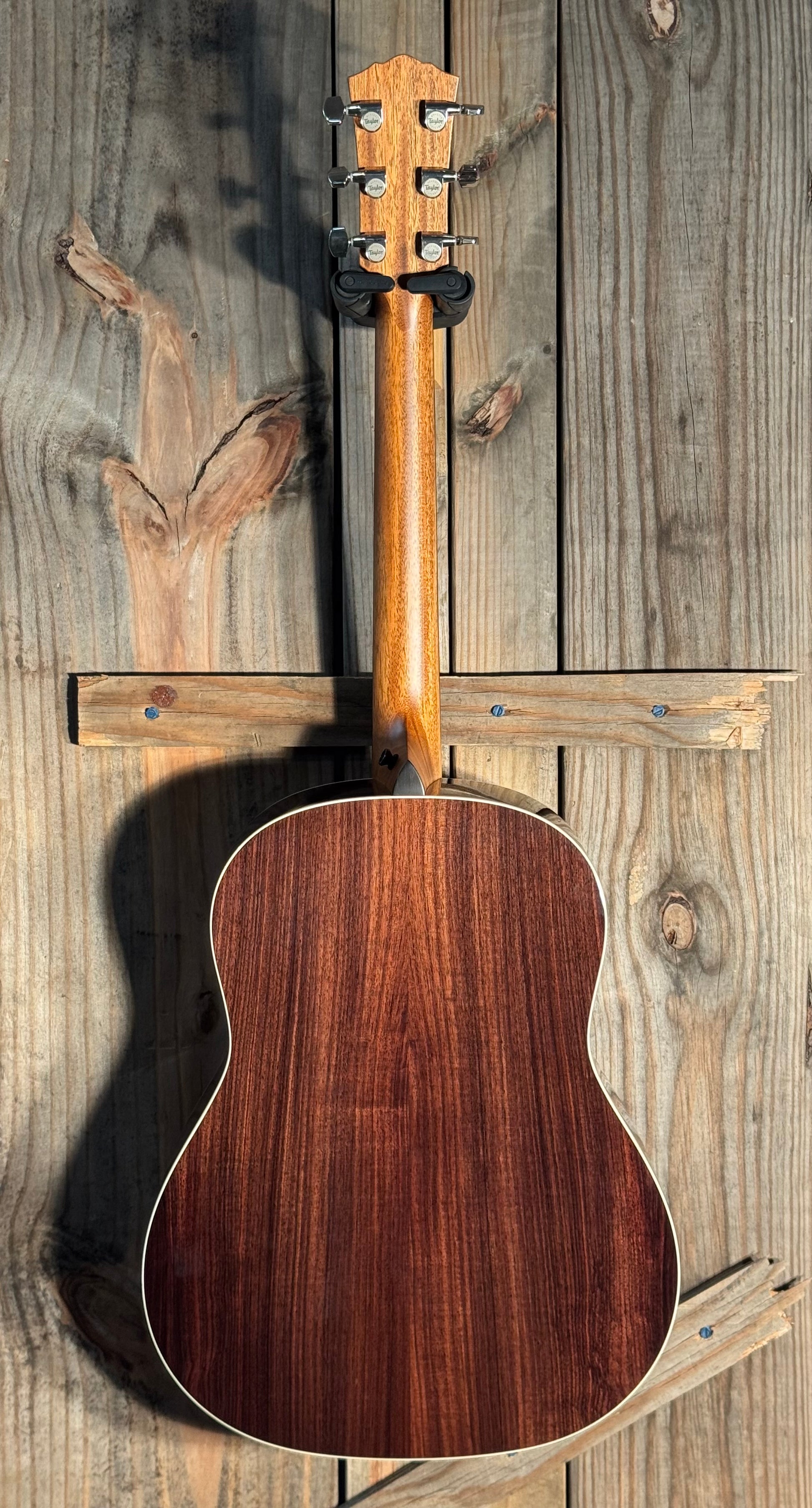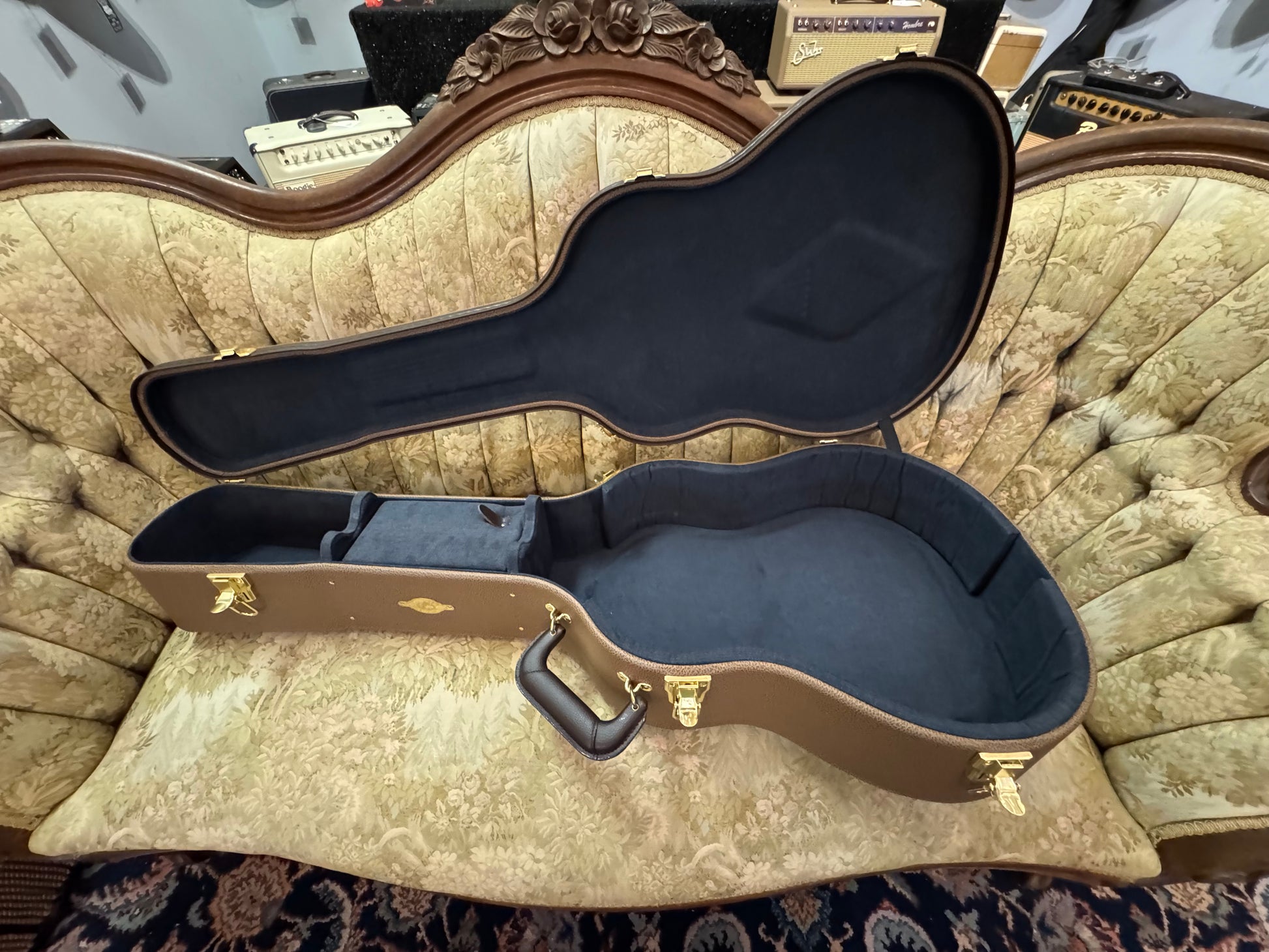 Visual appointments reflect the guitar's old-school sound, including a firestripe pickguard, a Curve Wing bridge in Honduran rosewood with Indian rosewood bridge pins, and cream-colored binding, rosette and Crest inlays. This model ships with LR Baggs Element VTC electronics for warm, clear plugged-in sound and a deluxe hardshell case with a British Cocoa exterior.