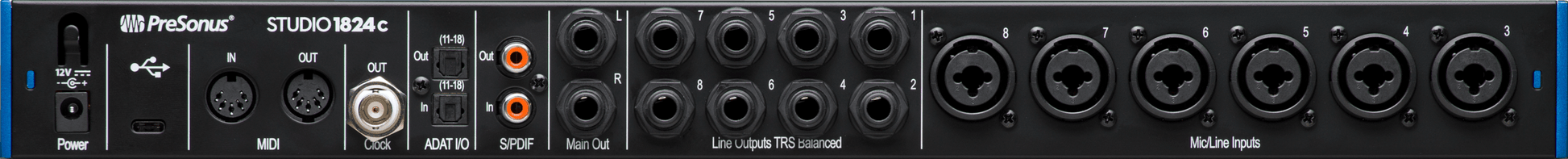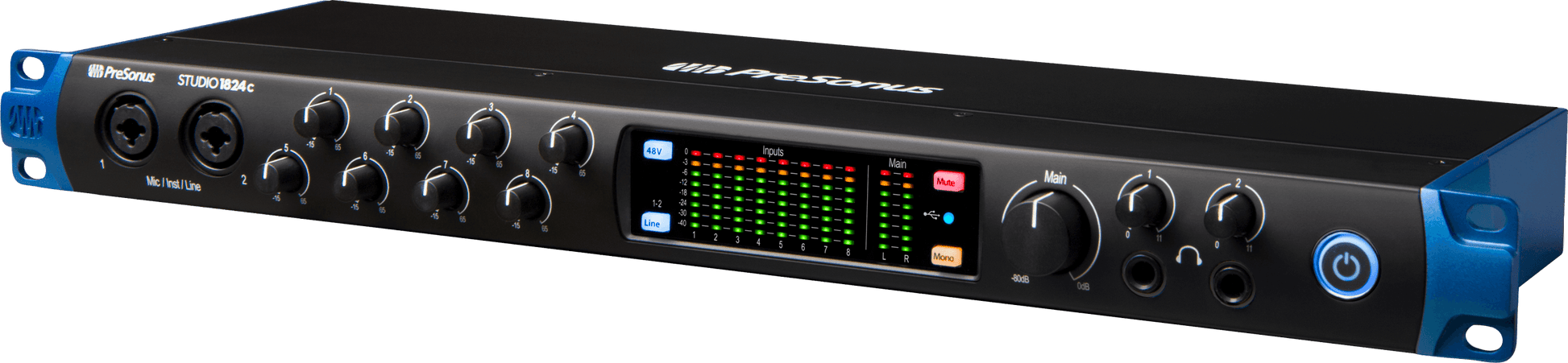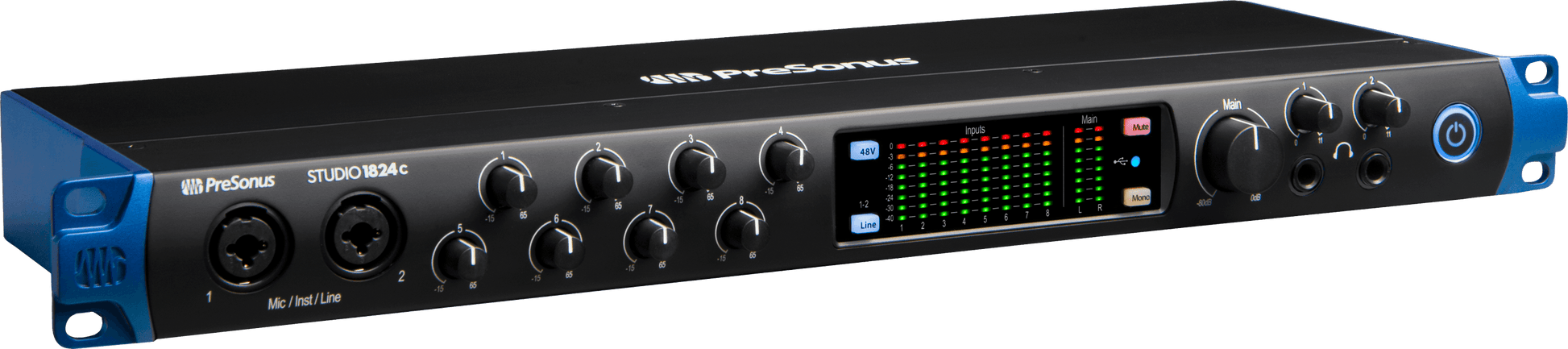 PreSonus® was a pioneer in high-channel-count audio interfaces and has spent the last 20 years creating the best audio interfaces for recording large sessions. Building on this legacy, the Studio 1824c provides amazing sound-quality with eight of PreSonus' lauded XMAX analog mic preamps onboard and pristine 24-bit 192 kHz conversion. Add two low-noise instrument preamps, balanced line-level inputs, and an ADAT input to add 8 more channels whenever you need them, and you have an audio interface ready to record just about any session.