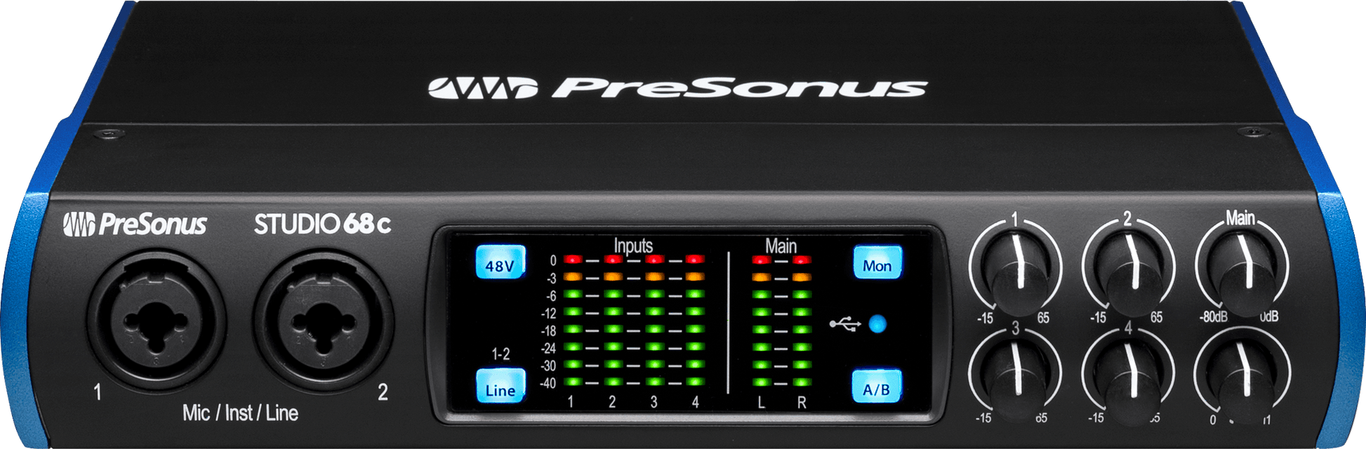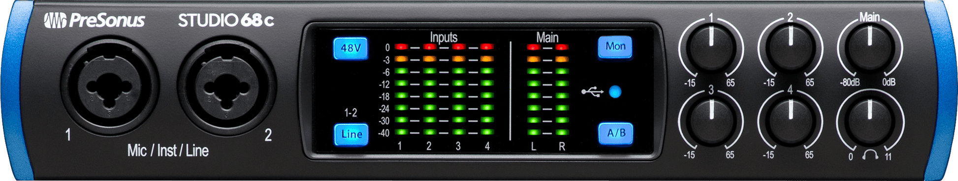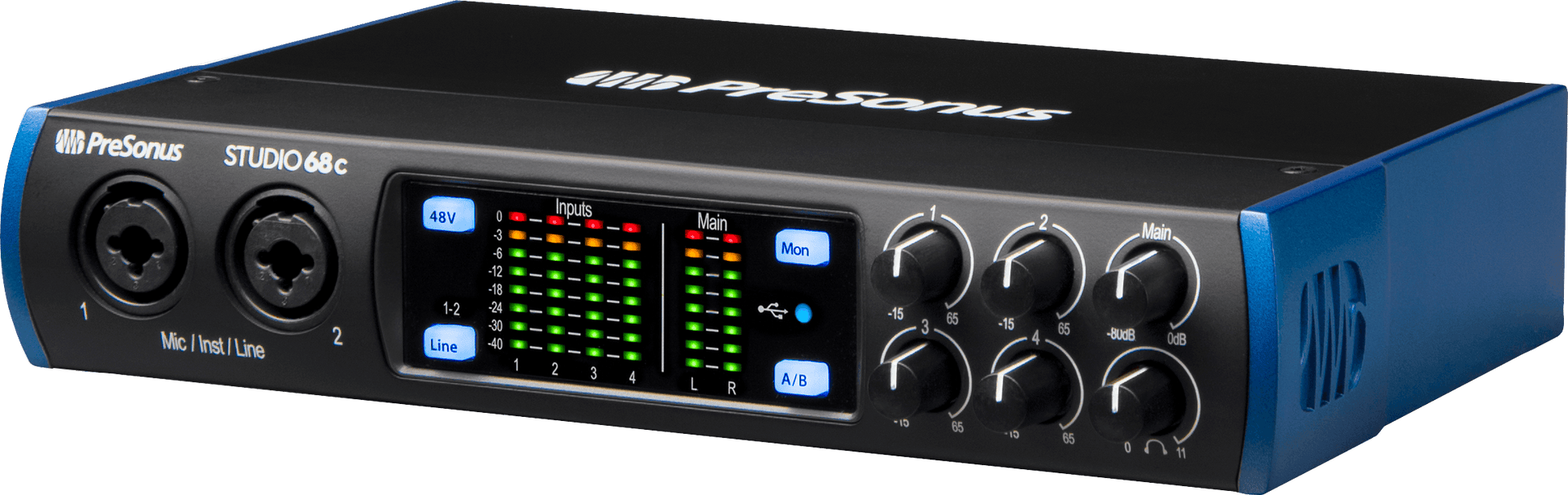 Ideal for small productions and electronic artists, the Studio 68c provides stunning sound quality with four of PreSonus®' famed XMAX analog mic preamps, plus professional metering and monitoring features. Two stereo outputs provide flexible output options. A powerful headphone amp with A/B switching lets you listen in to either mix, ideal for live-performance applications. The Studio 68c is an audio production powerhouse right out of the box.