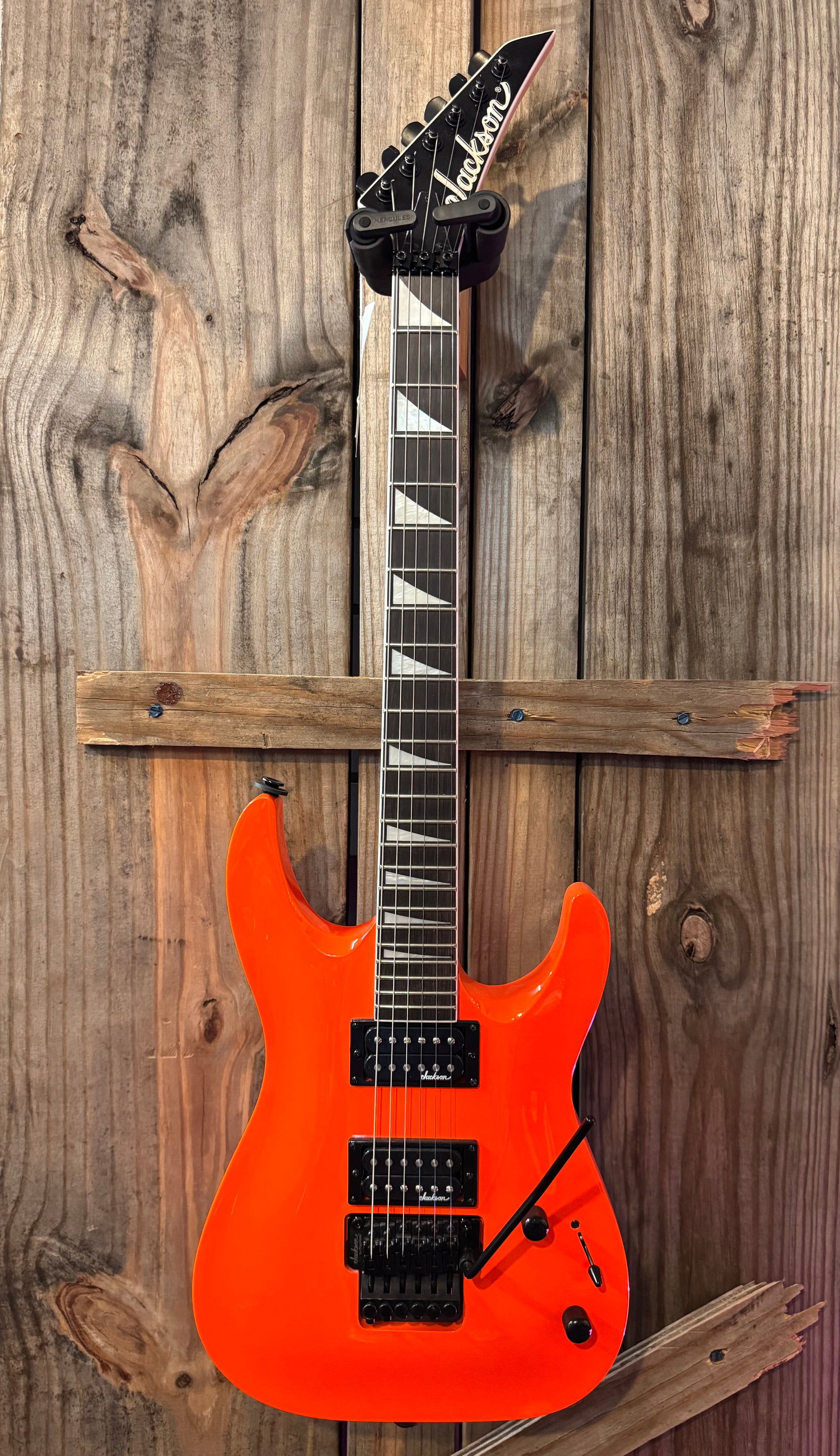 The Jackson JS32 Dinky solidbody electric guitar conveys instant attitude both sonically and visually. The amazingly affordable JS32 Dinky serves up thick, snarling tone and prodigious sustain, courtesy of its resonant, lightweight poplar body, arched top, and two high-output humbuckers. You'll appreciate the smooth playability of the maple speed neck. And the fully bound compound-radius fretboard is great for chording down low, and bending up high without fretting out. A real Floyd Rose licensed double-locking tremolo bridge completes the package, making the Jackson JS32 Dinky a guitar any serious player can love.